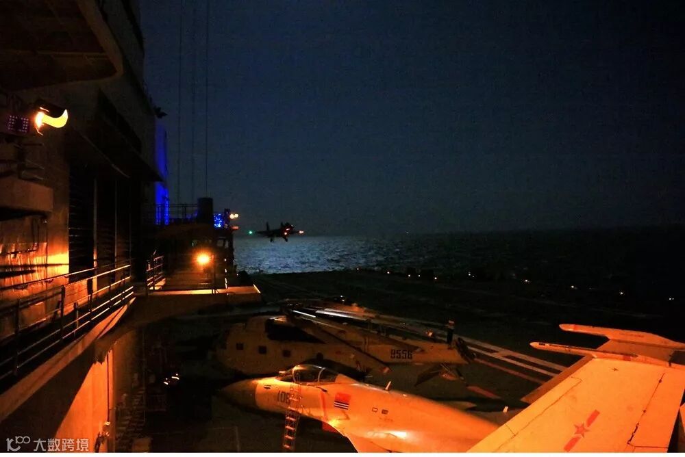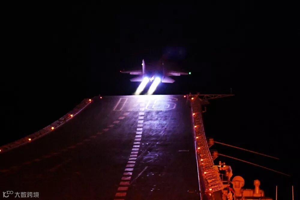 ▲歼15舰载战斗机进行夜间阻拦着舰训练。