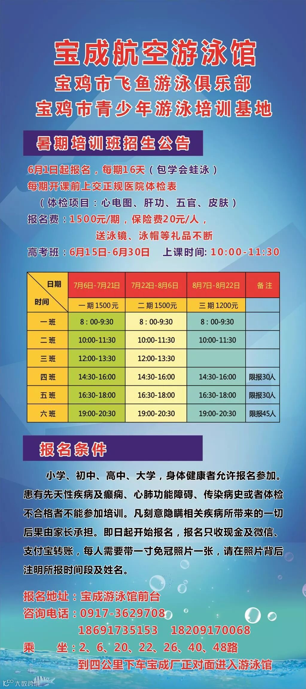 宝成游泳馆是我市“飞鱼游泳俱乐部”总部、“宝鸡市青少年游泳培训基地”,每年培训新学员1000余人,本馆地处清姜路繁华地段,先进的水处理设备使馆内水质多次受到媒体宣传表扬。宝成游泳馆是我市唯一一家由宝鸡市体育局、宝鸡市民政局颁发经营许可的正规游泳俱乐部,也是我市唯一一家被宝鸡市体育局授予游泳培训基地的游泳馆。