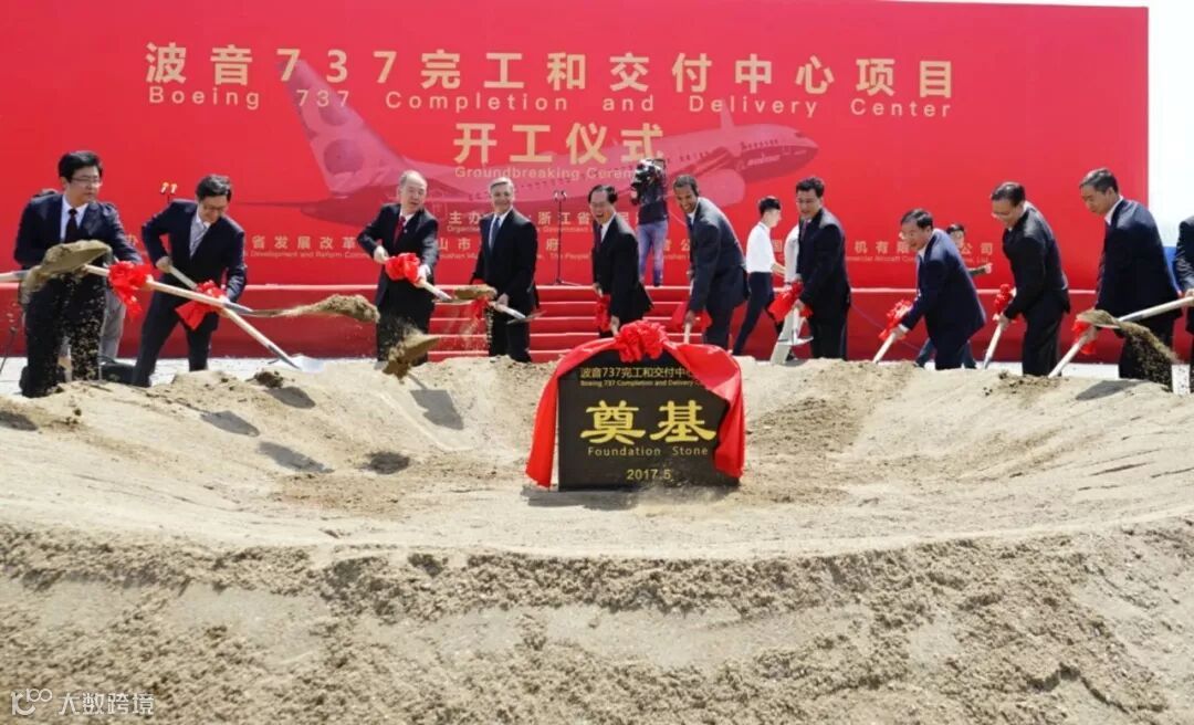 5月11日,波音737完工和交付中心在浙江舟山朱家尖航空产业园正式开工。这一中美战略性重大项目合作的标志工程,拉开了全面建设的大幕。波音737完工与交付中心项目由两个部分组成,一是波音公司与中国商飞合资的波音737完工中心,二是波音公司独资的737交付中心。该项目计划每月交付8至10架飞机,年交付量最高可达100架,预计2018投入运营为年底交付做好准备。