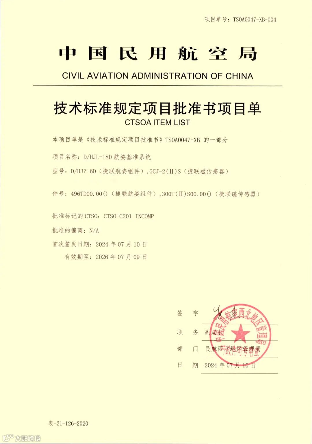 ▍该型航姿基准系统是宝成第四项CTSOA取证产品,标志着公司研制能力、适航能力得到进一步提升,为公司民机产业发展奠定了基础,同时也为AG600飞机TC取证做出应有的贡献。