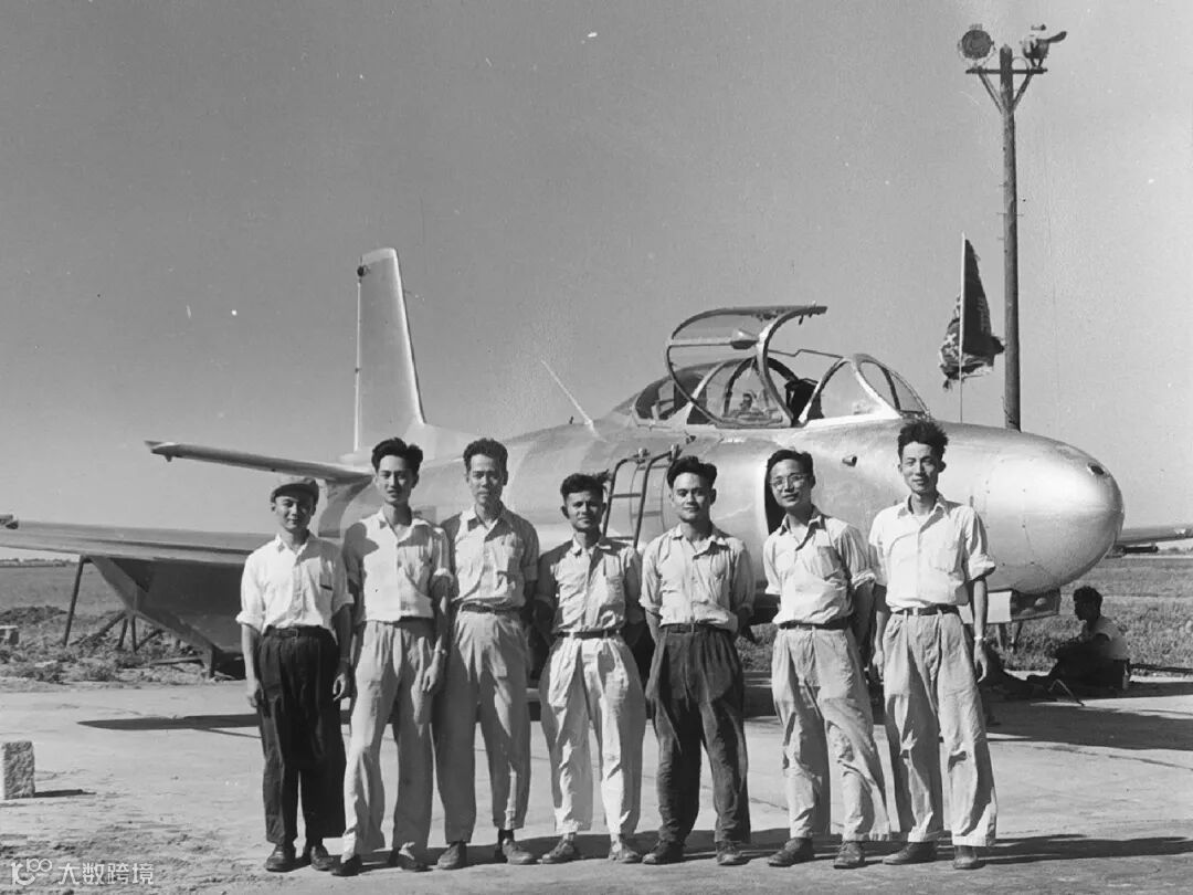 ▲第一个飞机设计室的主要人员在歼教1前合影(左起:陆孝彭、叶正大、徐舜寿、王汇青、程不时、顾诵芬、汪子兴)