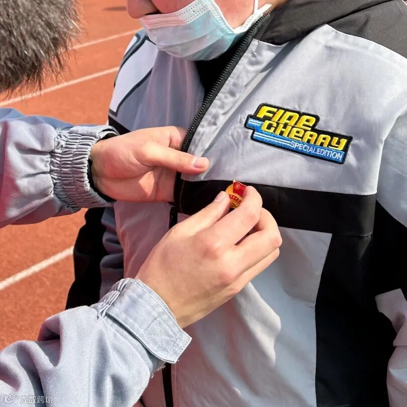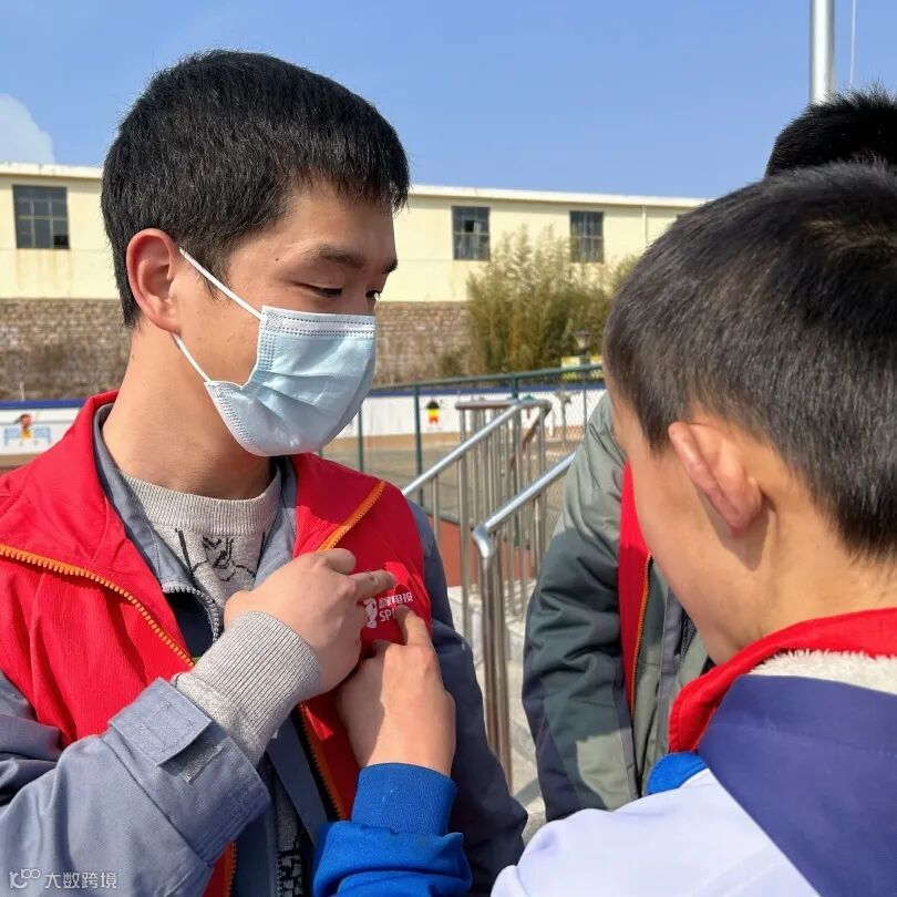 活动中,一位性格内向的小朋友看到志愿者们胸前闪耀的团徽,满眼羡慕。志愿者观察到后,将自己的团徽摘下送给了他,告诉他:“等你将来入了团,就是真正的共青团员了”。