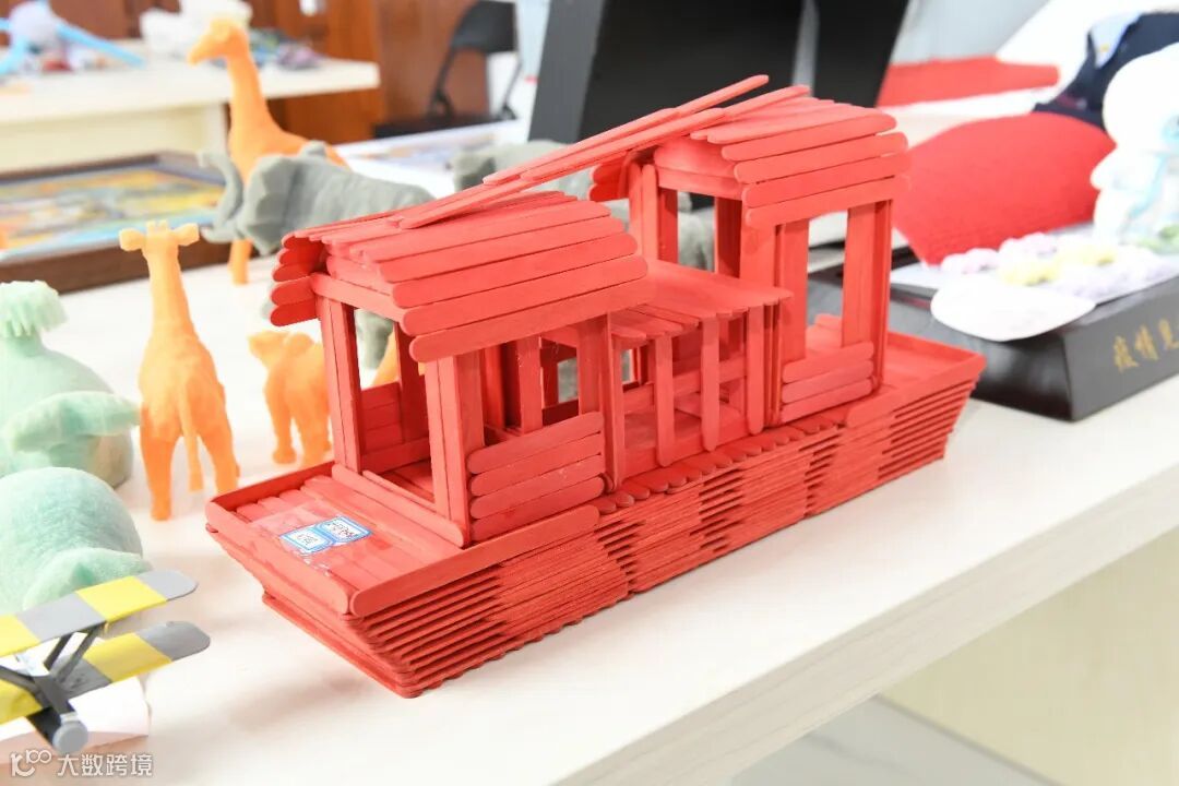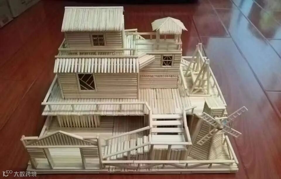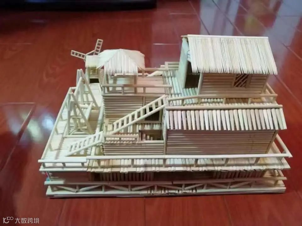 作品《盛世楼台》主体为一座古建筑,以工作中废弃的涂胶用木棒近千根为主要材料,将其裁剪为不同的长度,粘接制作成长42厘米、宽13厘米、高28厘米的古建筑。建筑由前殿和后殿组成除门轴为金属以外,其余均为木质材料,门均可开合,屏风与门采用“工”字锦。