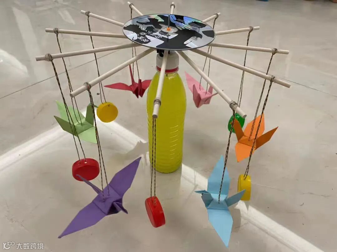 “旋转飞车”利用旧碟片、空饮料瓶、瓶盖、电机、电池等材料制作而成。当电池盒上的开关按下时,电路导通,电机转动带动瓶盖和千纸鹤旋转起来,令人心生愉悦。(孟媛)
