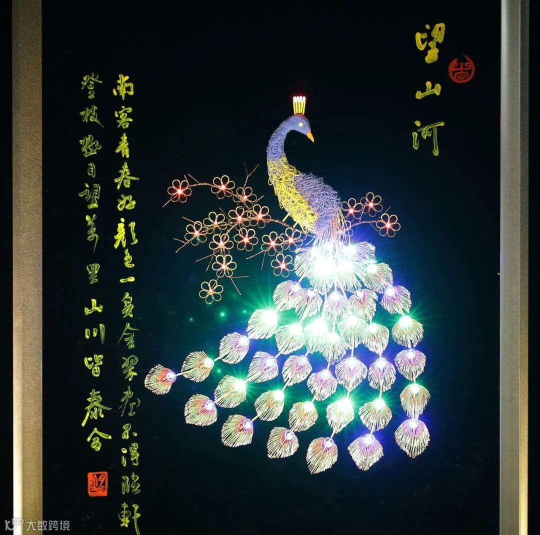 作品《望山河》以工作中废弃的导线头两千多余根以及铜丝等材料,运用焊接、胶接、电路设计等方法设计制作出孔雀造型,造型两侧融合职工书法题词及航空人守望山河的情怀释义,形成了精美的国画风。此作品表达航空人守望山河的情怀,祝福祖国繁华似锦、文化昌盛。