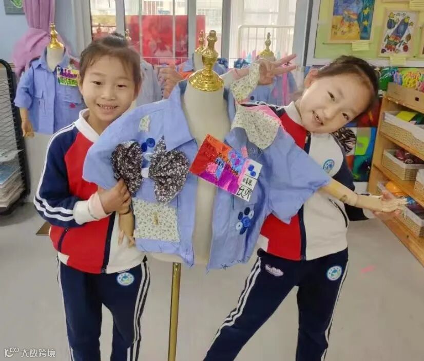 小朋友从家里带来了爸爸妈妈的旧厂服进行改造,先对自己的身体进行测量,再用剪刀裁剪掉多余的部分,然后请老师和家长协助对袖口、衣襟等处进行收边处理,小朋友拥有了属于自己的“小厂服”!