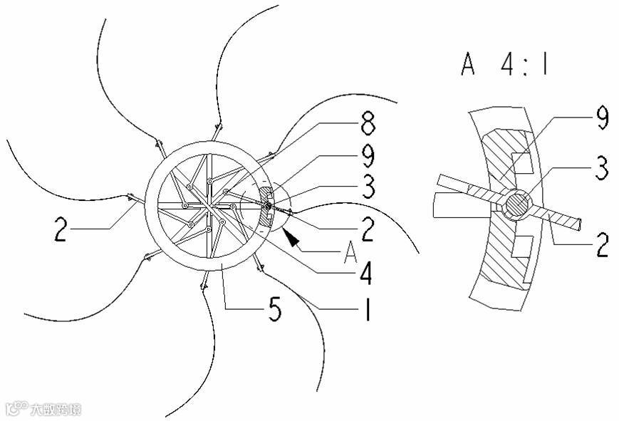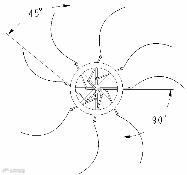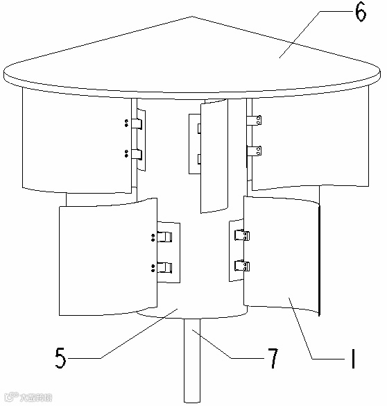 当风吹向叶片时,机架筒上迎风一侧叶片在风力的作用下推动摆杆绕其与机架筒组成的转轴旋转张开,同理背风一侧叶片旋转收缩,两摆杆的运动在连杆的联动作用下相互助力完成。限位档块9在迎风侧叶片完全张开后限定摆杆继续转动;同时也限定了背风侧叶片的收缩角度,以防叶片收缩过度,影响下一个周期的正常张开。