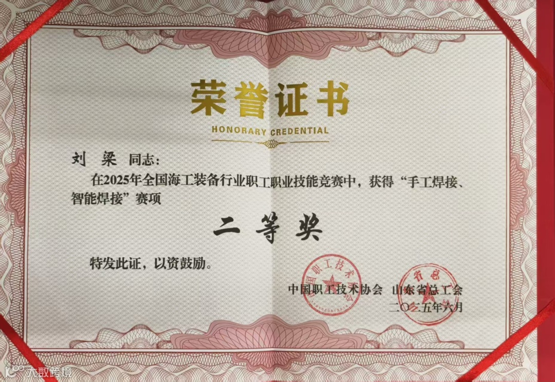 6月28日,2025年全国海工装备行业职工职业技能竞赛在山东威海圆满落下帷幕。来自核工业、中石化等企业的69名选手报名参赛。公司生产技术部焊工刘梁、孙佩超分别荣获手工焊接、智能焊接赛项个人二等奖、三等奖,公司获得赛事优秀组织单位称号。