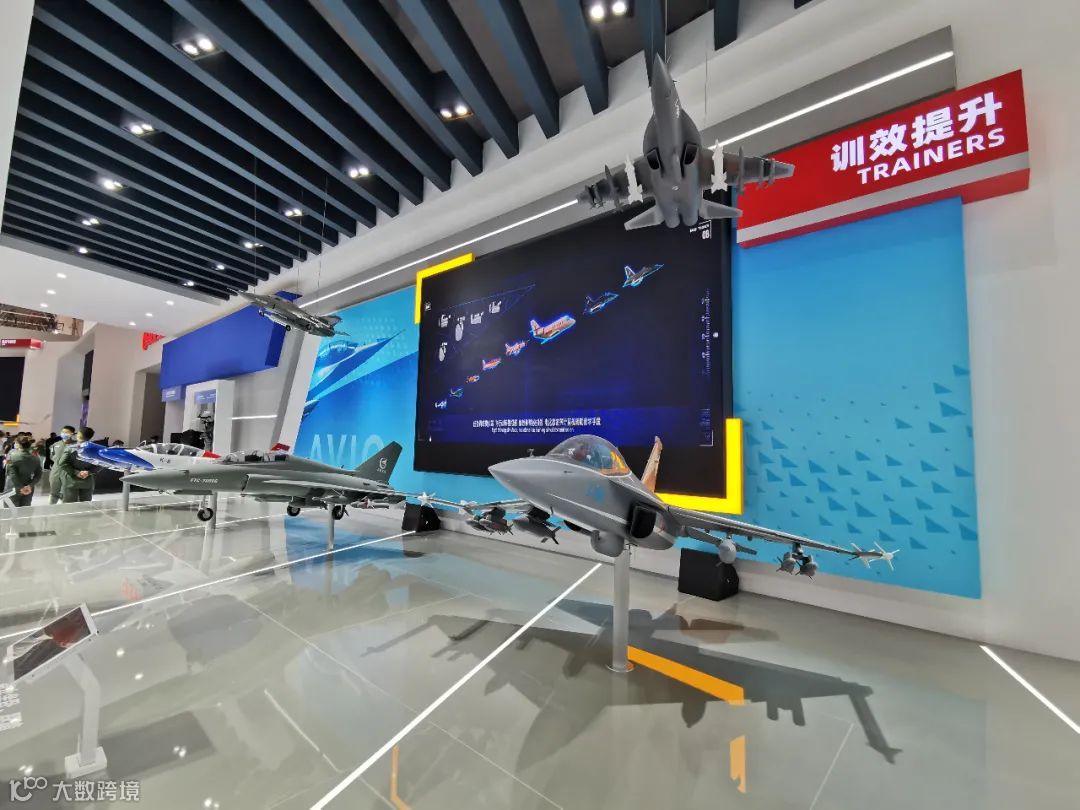 展台展示了初教6初级教练机、K8基础教练机和FTC2000、L15高级教练机等初、中、高级教练机,以及与飞行员培训有关的训效能力体系。