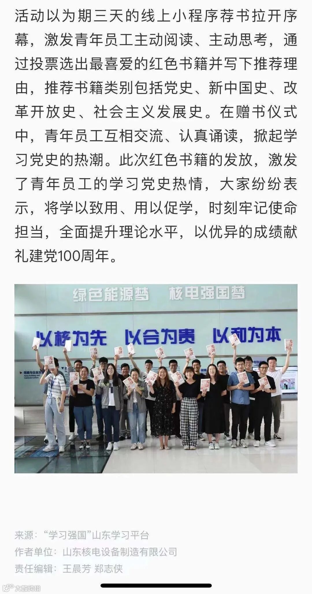 7月20日,“学习强国”平台以《青春向党 | 山东核电设备制造有限公司团委举办“学史赠书办实事”主题活动》为题,对公司团委深入开展“学史赠书办实事”主题活动进行了宣传报道,快来一起看看吧。