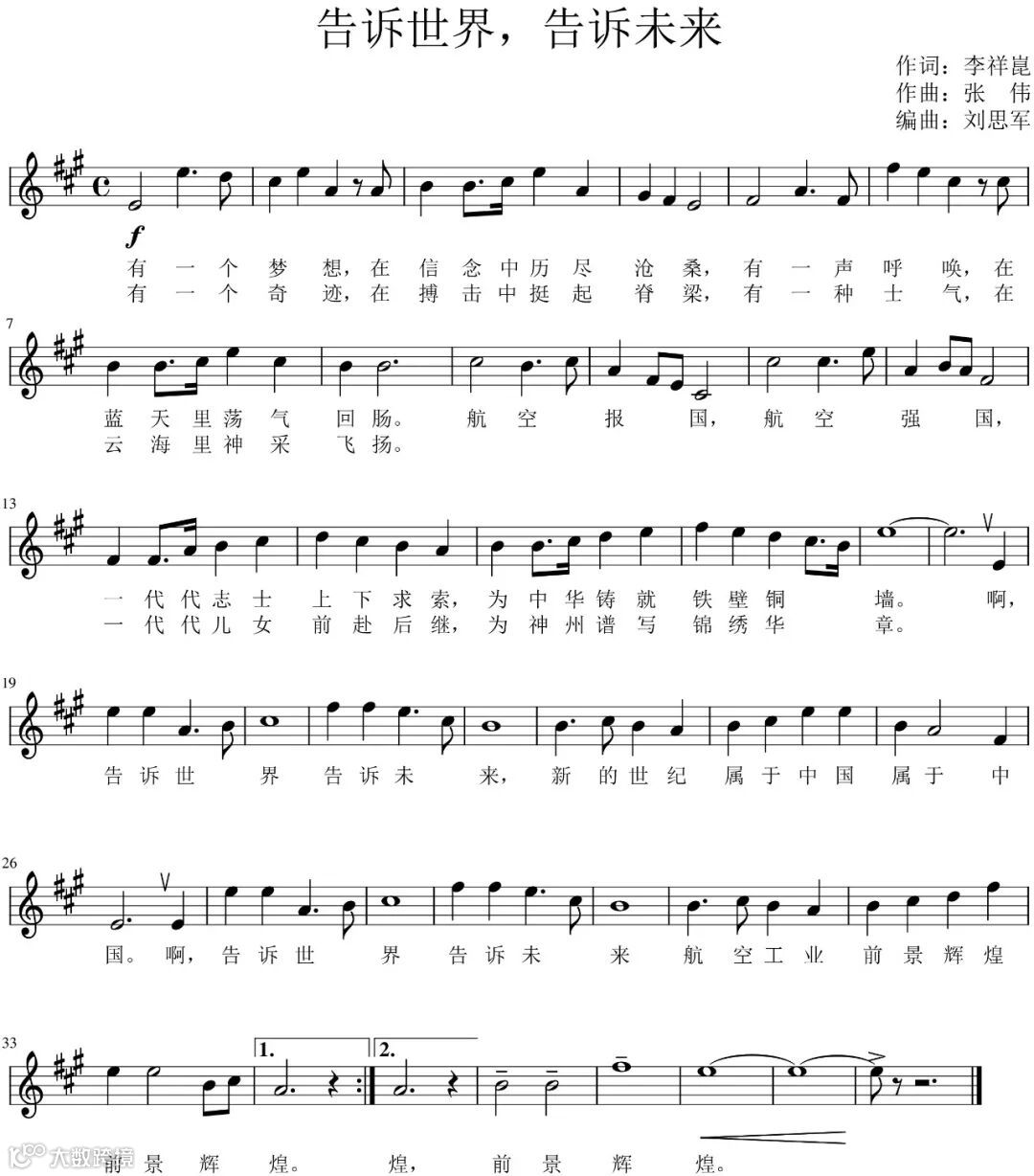 新版《告诉世界,告诉未来》的歌谱、音频文件已在航空工业官方网站发布,MV也将在近期上线,可前往航空工业官方网站下载中心下载。