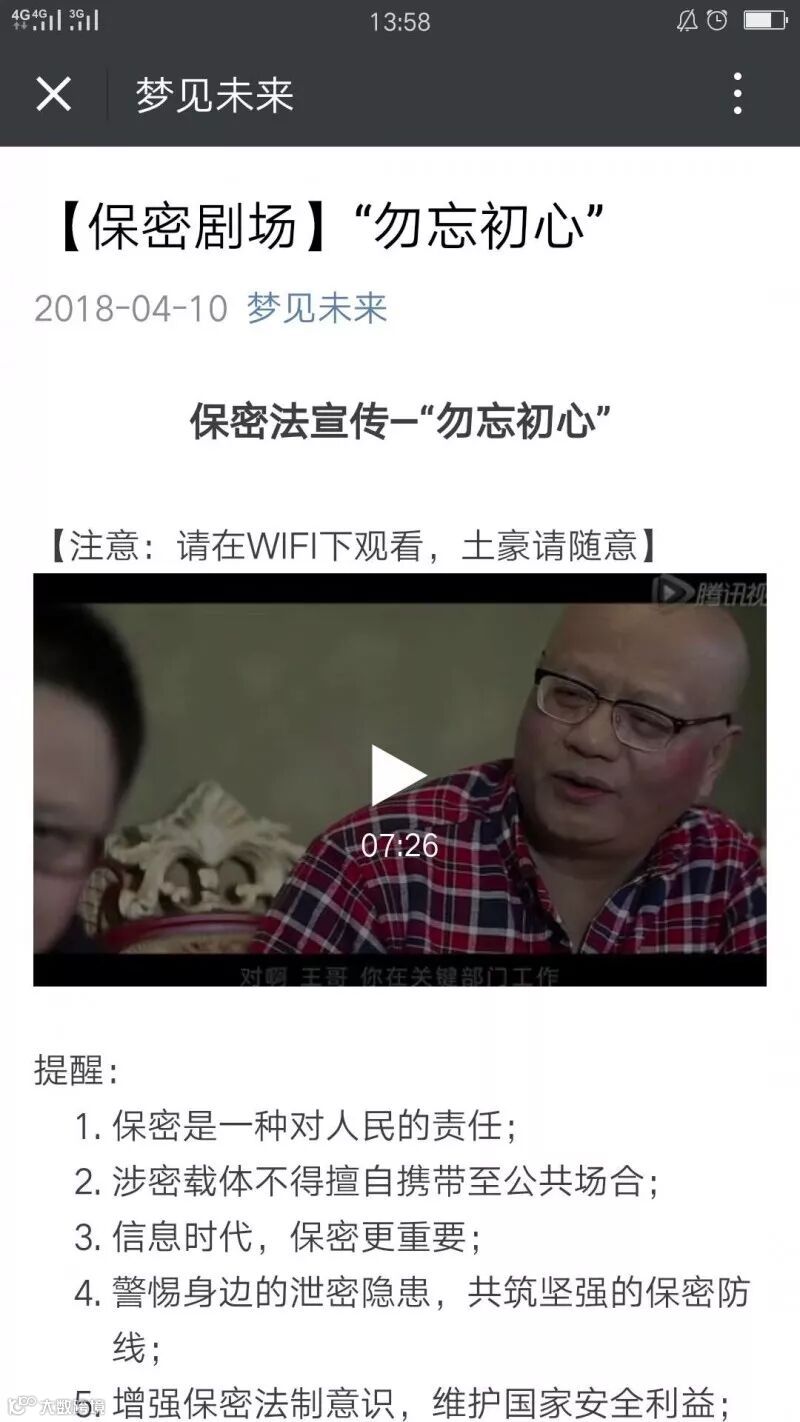微信公众号发布“勿忘初心”保密教育视频,