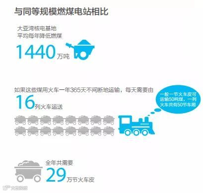与同等规模的燃煤电站相比,大亚湾核电基地平均每年降低燃煤1440万吨,如果这些煤用火车一年365天不间断地运输,每天需要由16列火车运送(一般一节火车皮可运输50吨煤,一列火车共有50节车厢),全年共需要29万节火车皮。