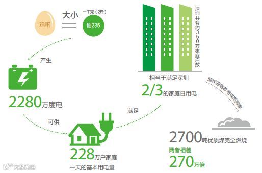 一个鸡蛋大小的铀235,可以产生2280万度电,可满足228万户家庭一天的基本用电需求,相当于满足了深圳2/3的家庭日用电。若相同的电量用燃煤来提供,则需要2700吨优质煤完全燃烧,两者相差270万倍。