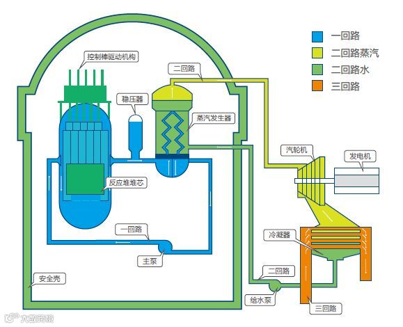 三回路:通过凝汽器和海水将二回路的蒸汽冷却,蒸汽冷却之后变成水,然后这些水又被输送回去加热成蒸汽。