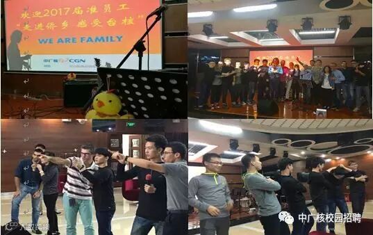 晚上举行了“WE ARE FAMILY”主题晚会,以一曲“大亚湾的孩子”开场,温馨而热烈,欢迎加入台山大家庭的新成员,2016届新员工的小品“住在黄金海岸”让大家笑声不断;2017届准员工集体表演的舞蹈及小品,虽是来台山现场后方才准备,但展现了90后的热情及多才多艺,赢得了大家的掌声;法方乐队的表演则将晚会推向高潮,表演结束后大家纷纷上台求合影留念。