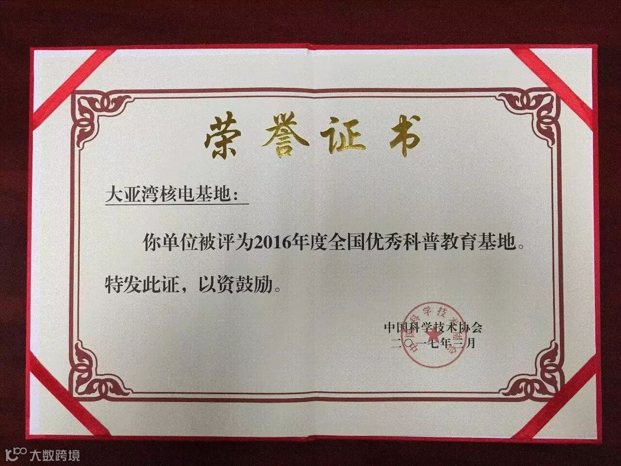 日前,在中国科学技术协会组织开展的全国科普教育基地2016年度科普工作考评中,经全国申报、单位初评、专家评审等环节的严格选拔,中广核大亚湾核电基地脱颖而出,获评年度“全国优秀科普教育基地”。