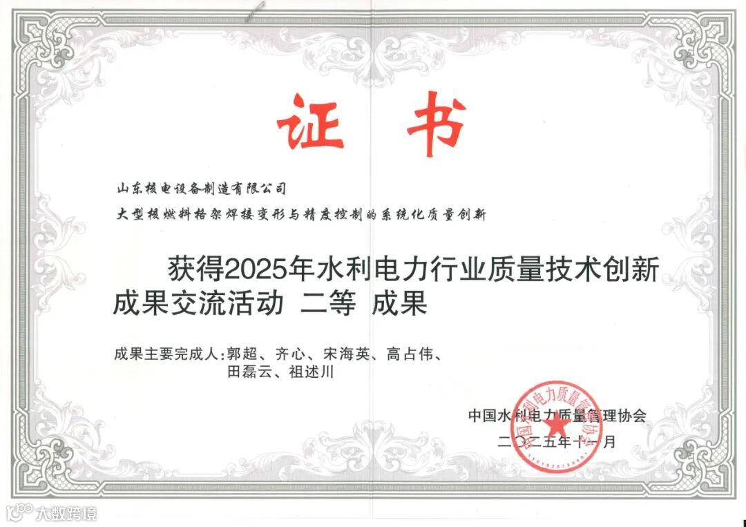 《大型核燃料格架焊接变形与精度控制的系统化质量创新》荣获中国水利电力质量管理协会成果交流二等成果,该项研究系统解决了焊接精度控制难题。《“双归零”质量问题快速反馈机制的研究与应用》获三等成果,该机制显著提升了质量问题闭环处理效率。