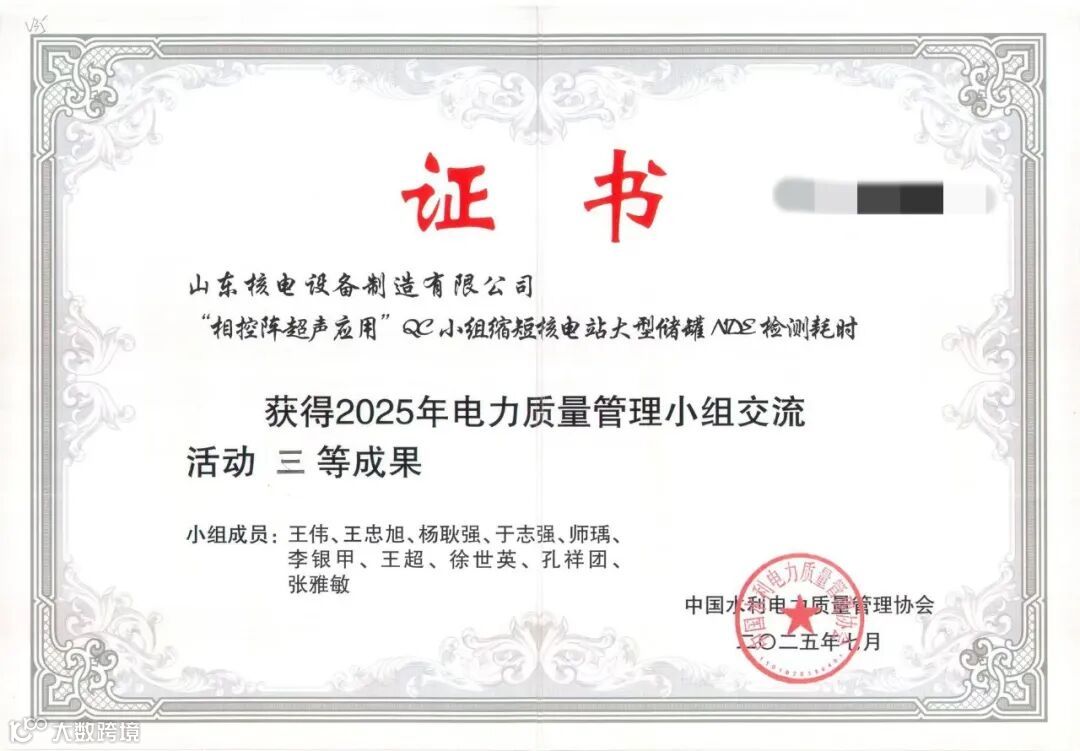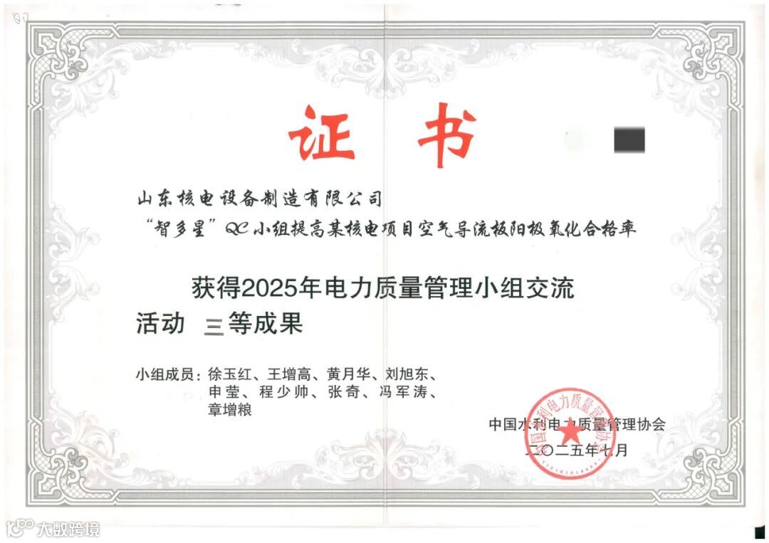 另外,在2025年电力质量管理小组交流活动中,《提高某核电项目空气导流板阳极氧化合格率》《缩短预埋板安装辅助工时》《缩短核电站大型储罐NDE检测耗时》三项课题获三等成果。课题均围绕生产与检测中的实际问题,通过方法优化与流程改进,取得了良好实效。
