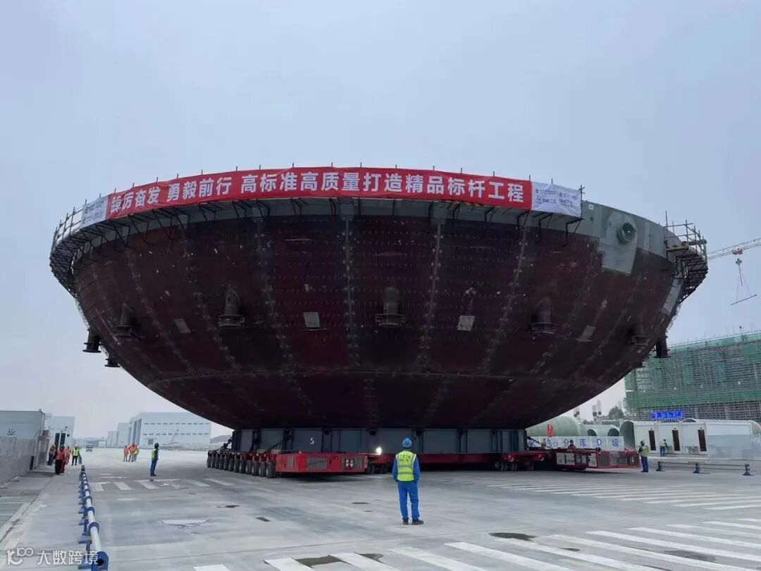 CAP1000底封头直径约为40米,整体高度约为12米,重达646吨,呈半椭球形。该模块尺寸大,施工中存在板材厚、重量重、组成钢板多、焊接变形不一致等诸多难点,国核设备发挥模块化建造优势,采用倒装法,严格过程管控、质量管控,减少组装支撑,大大缩短了工期。