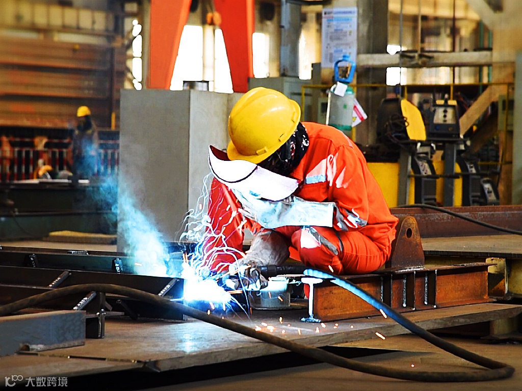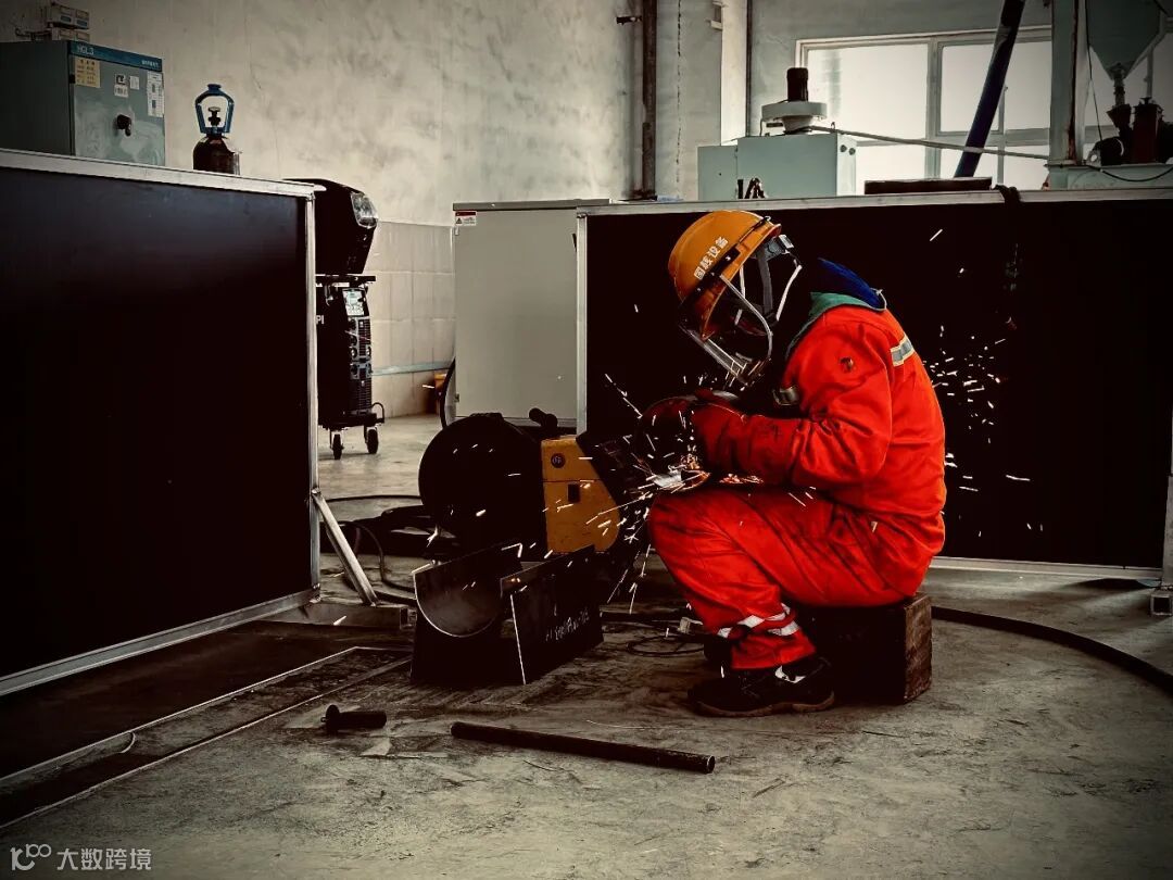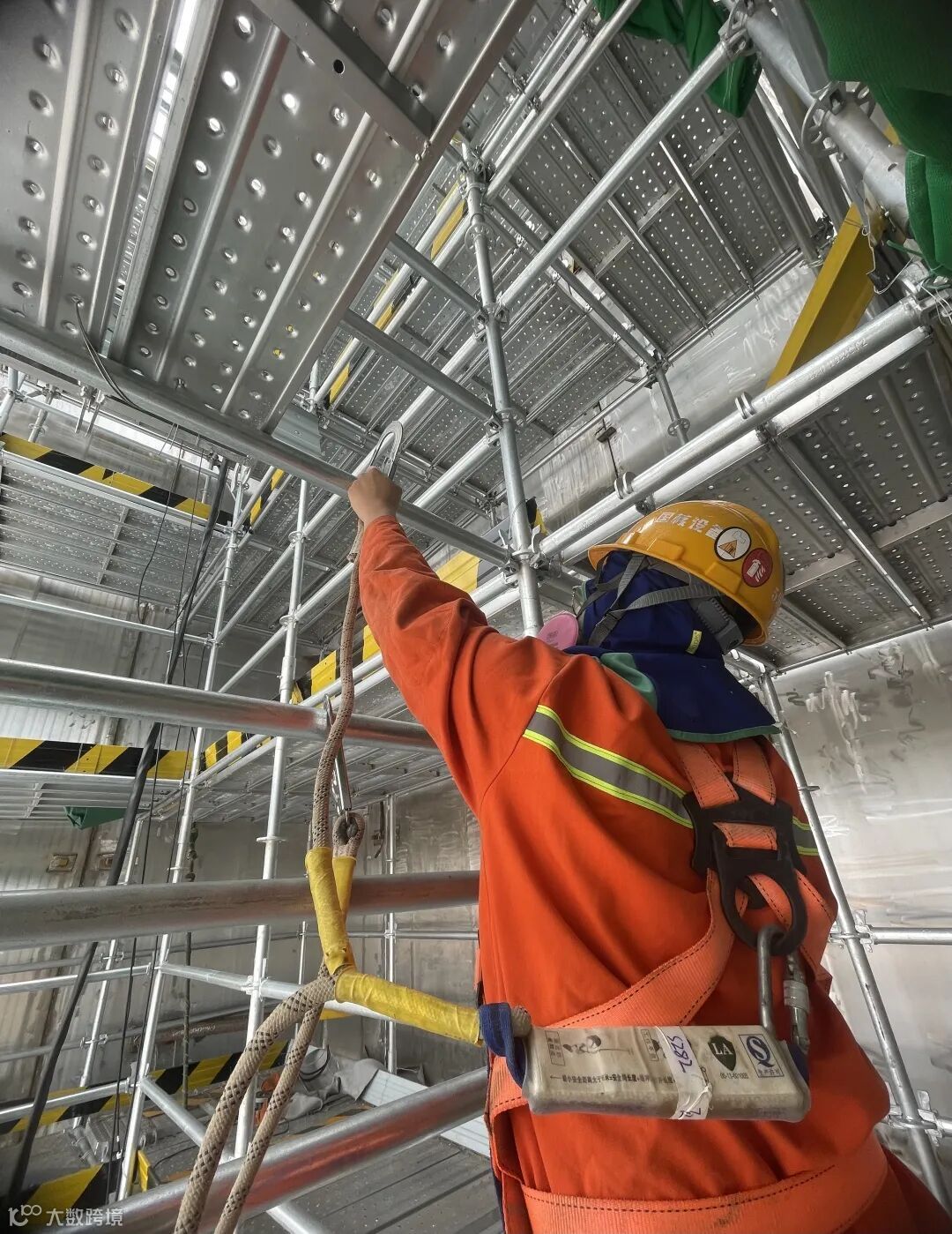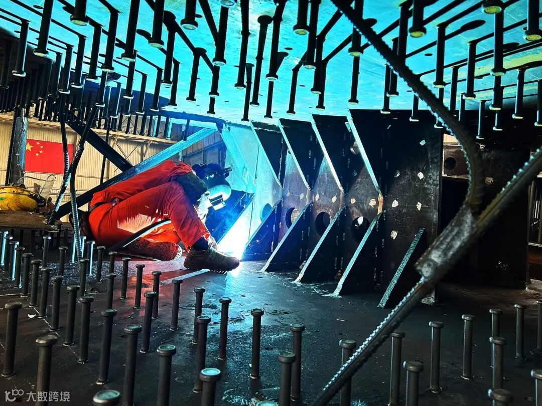 一名焊工顶着高温穿着沉重的防护装备攀爬到距离地面三四十米高的工作地点进行焊接。