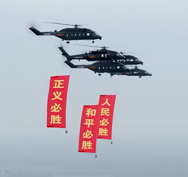 2025年9月3日,北京天安门广场迎来了一场意义非凡的活动——纪念中国人民抗日战争暨世界反法西斯战争胜利80周年大会。当空中护旗梯队的直升机如雄鹰展翅般飞越广场上空,直升机吊挂着的旗帜和标语在风中飘逸,红金交织的色彩在蓝天映衬下宛如燃烧的火焰,格外夺目。