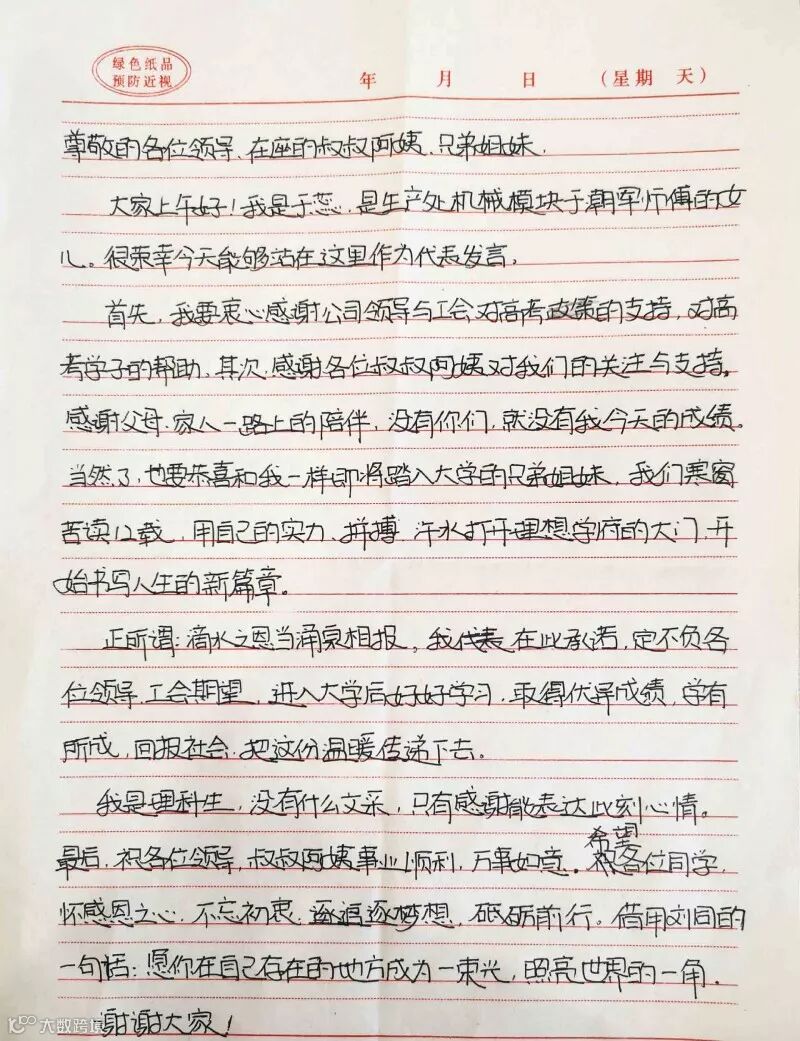 受助学生代表于蕊在发言中表示一定会常怀感恩之心,不忘初衷、追逐梦想、砥砺前行,将企业的关爱化作自强不息的精神动力,学有所成,回报国家、回报社会、回报父母。