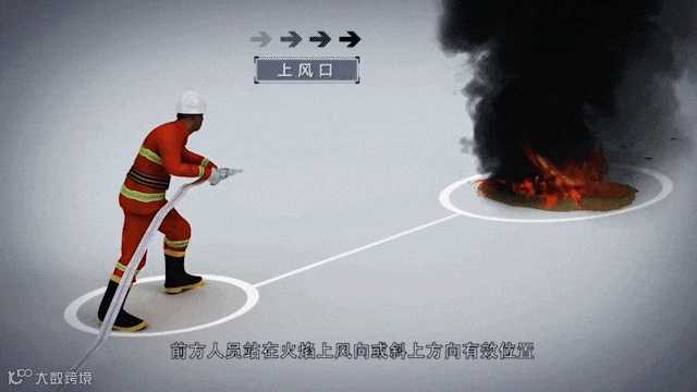 前方人员站在火焰上风向或斜上方向有效位置,一手握水枪另一手把持水枪与水带连接处,前腿弓后腿蹬,做好射水姿势。