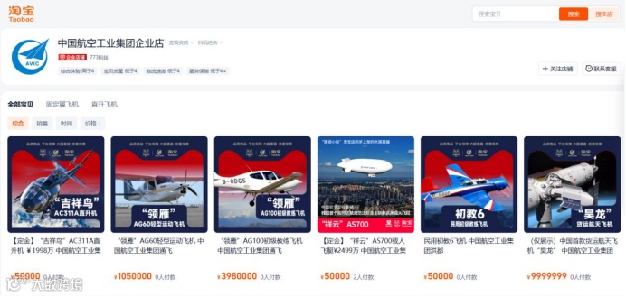 最终,湖北荆门城控集团属下文旅公司在淘宝网页版交下了5万元定金锁定AS700订单及价格优惠,江西飞行学院在线支付了两架共10万元的定金。