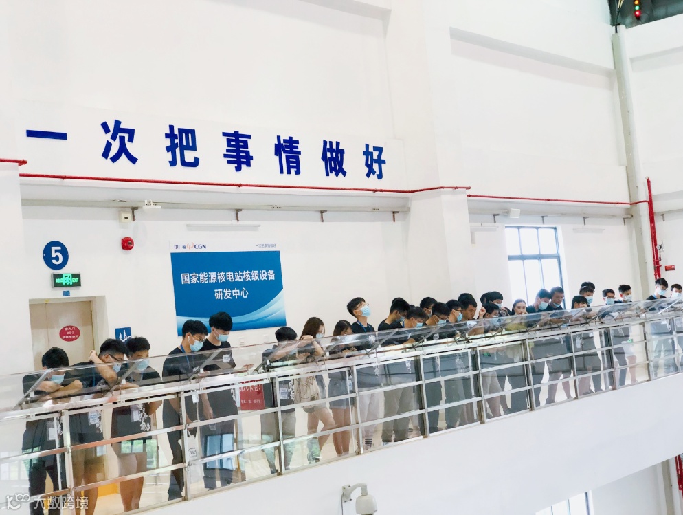 参观大亚湾基地培训中心模拟机训练室与技能中心换料水池,学生们惊呼高大上,对操纵员们的练成与换料的过程深感佩服,通过讲解员也了解到当年黄金一代的“黄金人”们的不易。