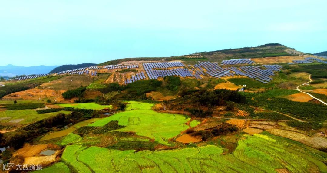 一台台风机矗立在山脊间,伴着阵阵春风,输送绿色电能,助力低碳减排;绿色为底的山坡上,光伏板形成一片片蓝色海洋,交相辉映出多彩美景。