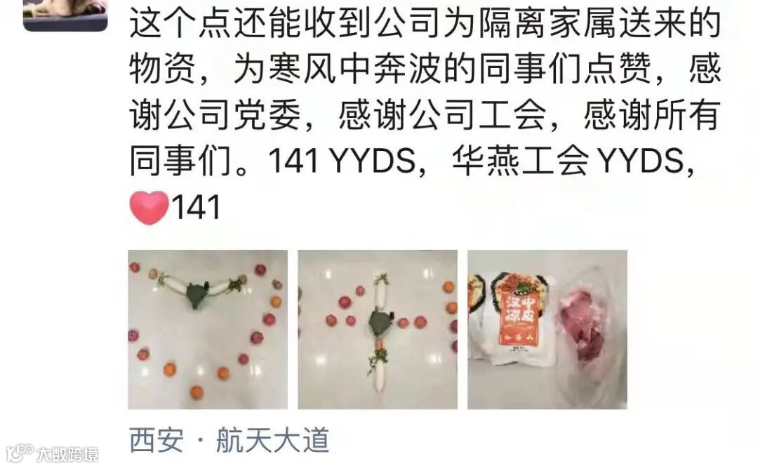 1月3日,公司收到航空工业陕西现场指挥部向西安航空工业兄弟单位捐赠的米、面、油、肉、蔬菜、水果和汉中面皮等十余种丰富的生活物资。公司在做好园区基本生活保障的同时,还时刻关注管控区的员工及员工家属,组织志愿者们将物资卸车、搬运、分配、打包,于当晚 23点前完成了力所能及的48户职工和职工家属的物资配送工作。