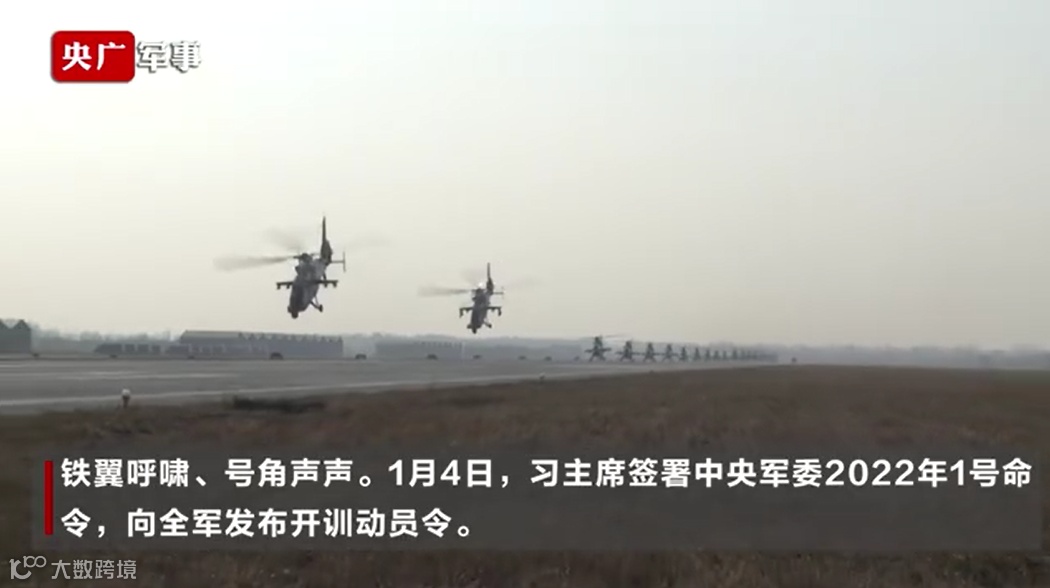 在开训现场,陆军官兵们全副武装、士气高昂,30余架战鹰划破长空,接连完成先期火力打击、无人机侦察、机降战斗等课目。