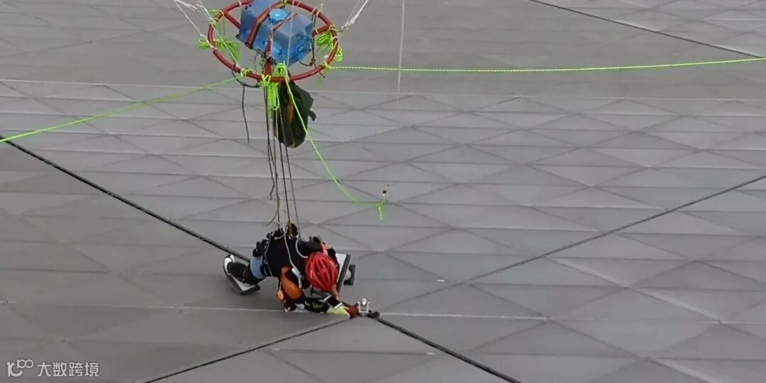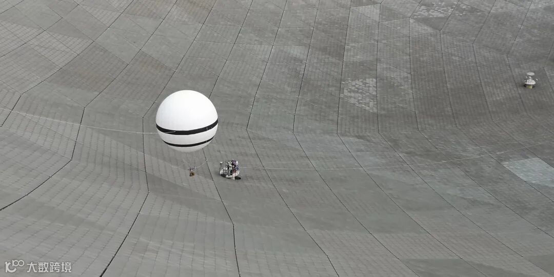 所谓“微重力蜘蛛人”系统,其实就是一个直径7.6米的氦气球载着作业人员在望远镜反射面上行走,利用氦气球的浮力将人的重量降到原来的六分之一左右,这样人就变成了微重力,达到望远镜反射面结构能够承受的重量。
