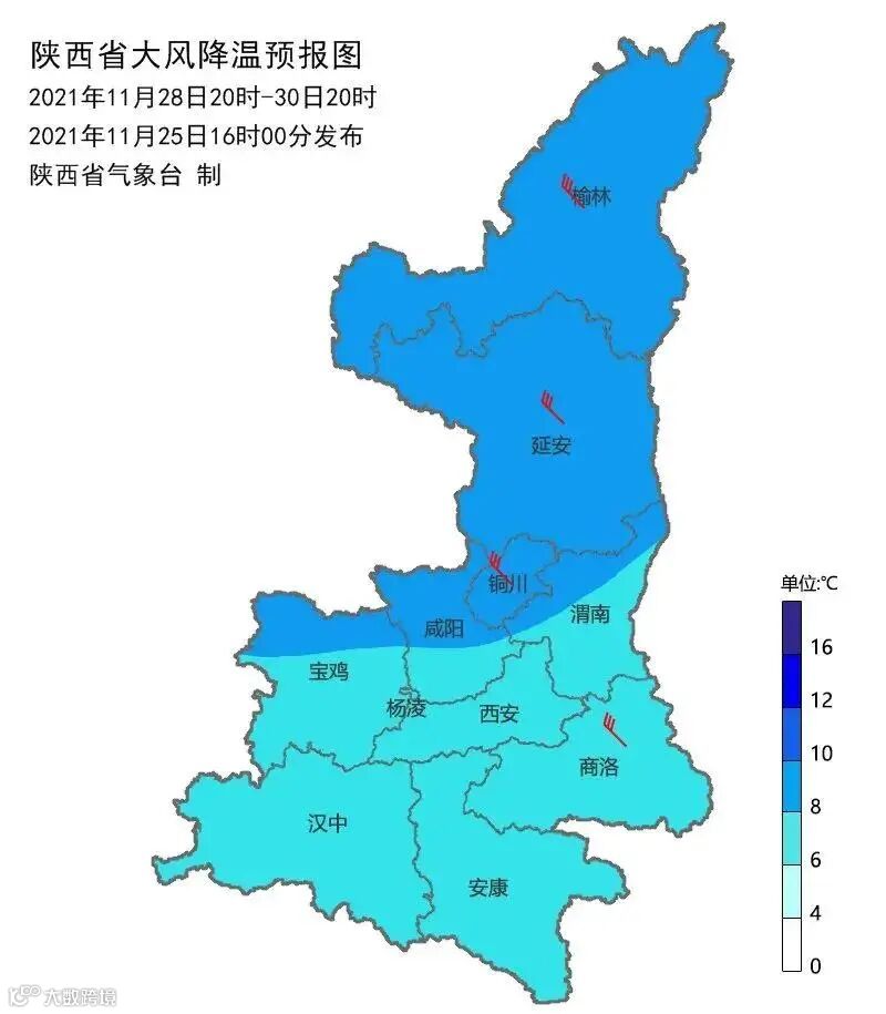 28-30日气温持续下降,过程降温:陕北、关中北部下降8~10℃,关中南部、陕南下降6~8℃。