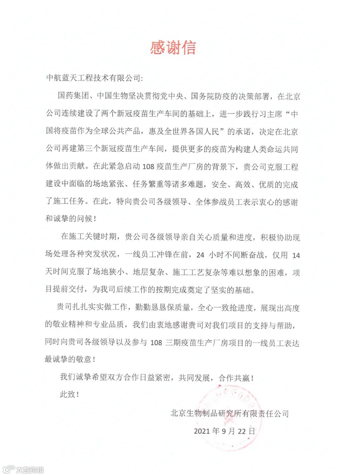 导读:在国庆节前,航空工业勘察院下属中航蓝天工程公司收到了来自国药中生北京生研所发来的感谢信,充分肯定了航空人