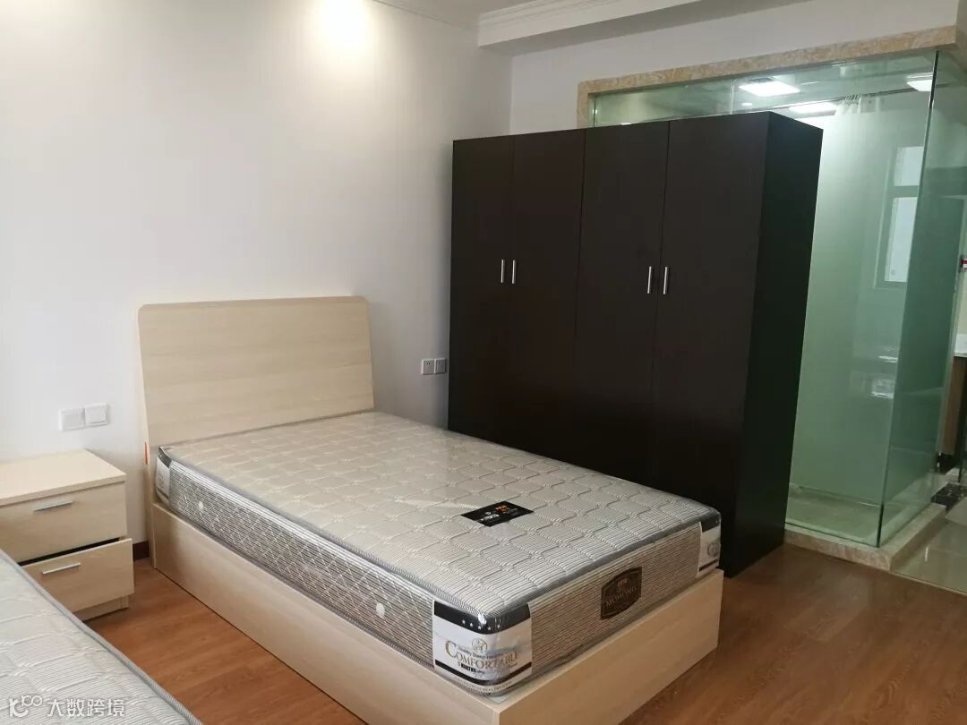 看,在咱们的公寓里,统一的星级酒店标准间的档次,空调、热水器、衣柜、桌椅,一应俱全,分分钟拎包入住。