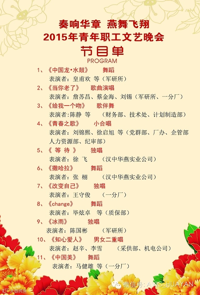 导读:中航工业华燕2015年五四青年文艺晚会演出时间:4月29日晚19:30,公司篮球场,诚邀广大青年朋友、职工家属前往现场,共庆五四。