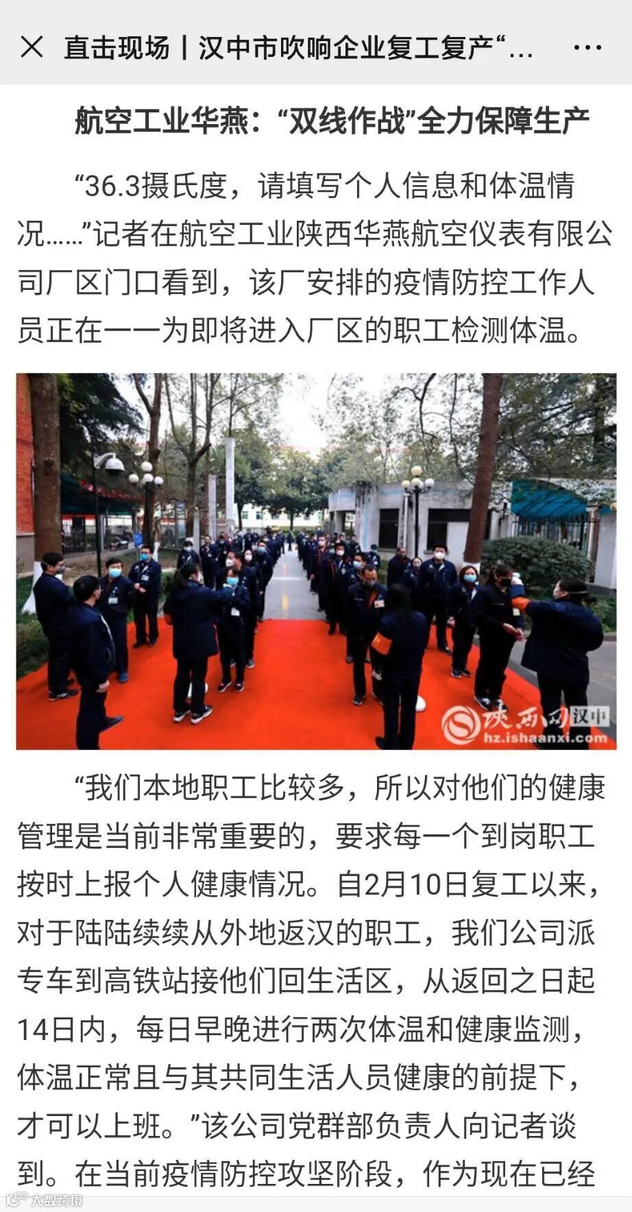 在此基础上,2月9日,南郑区政府防疫工作小组对公司进行了现场检查,经过细致了解认为航空工业华燕防疫工作扎实有效,具备复工条件。2月10日,航空工业华燕顺利复工,抢先开跑,走在了复工前列。