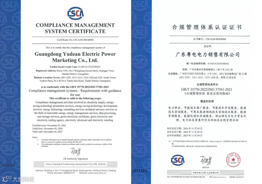 粤电售电公司于2024年11月顺利获得中标合信(北京)认证有限公司颁发的ISO 37301:2021和GB/T 35770-2022合规管理体系国际国内认证证书。