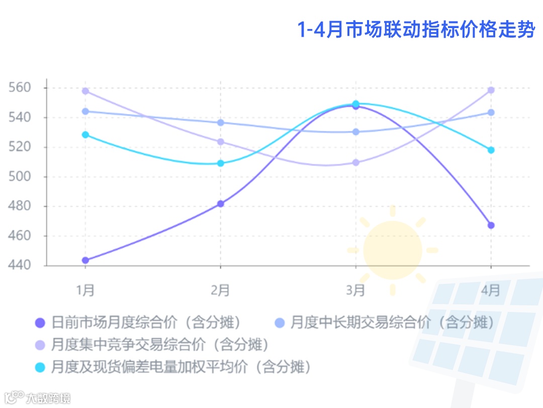 对比下图中今年1-4月市场联动指标价格走势,我们可以发现,四个主要的指标价格虽有波动但是波动幅度相对较小,且4月现货日前均价较3月出现明显下降。因此本次电费异常升高并非由电能量价格导致的,售电公司并没有多收取用户电费。