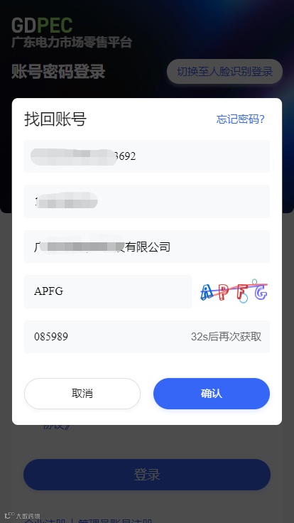 如要找回账号,请输入对应信息,点击“确认”。如果要找回密码,请直接点击“忘记密码”。