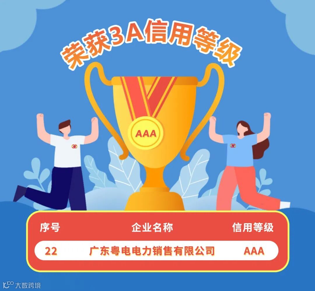 近日,中电联公布2021年全国涉电力领域企业信用评价结果,粤电售电公司喜获电力行业信用最高等级3A评定。
