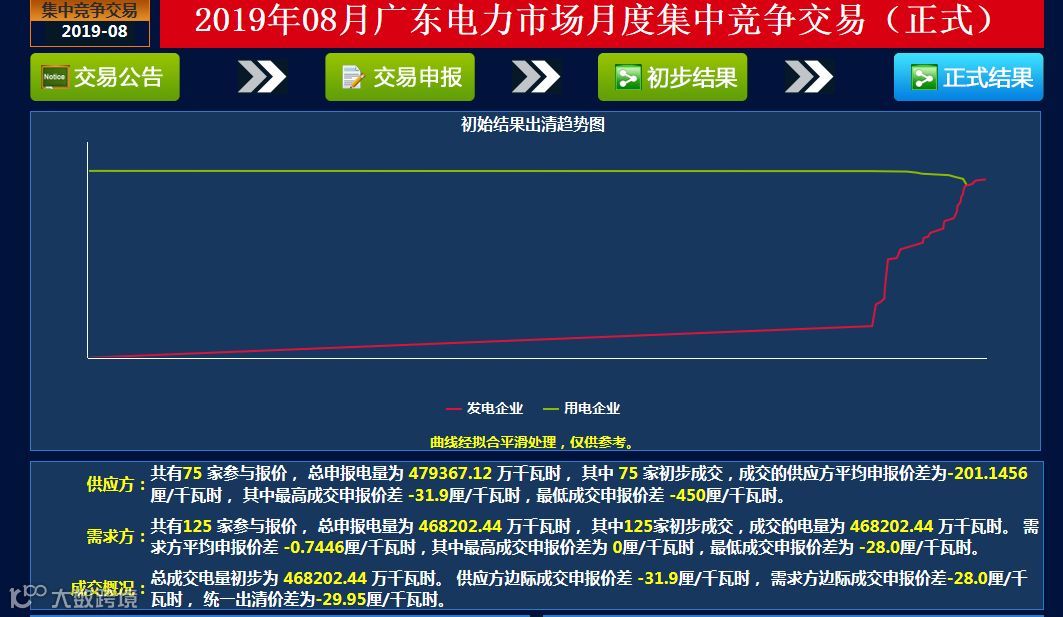 今日,广东电力交易中心组织举行了2019年8月份月度集中竞争交易。本次交易总成交电量为468202.44万千瓦时。供应方边际成交申报价差-31.9厘/千瓦时, 需求方边际成交申报价差-28.0厘/千瓦时, 统一出清价差为-29.95厘/千瓦时。