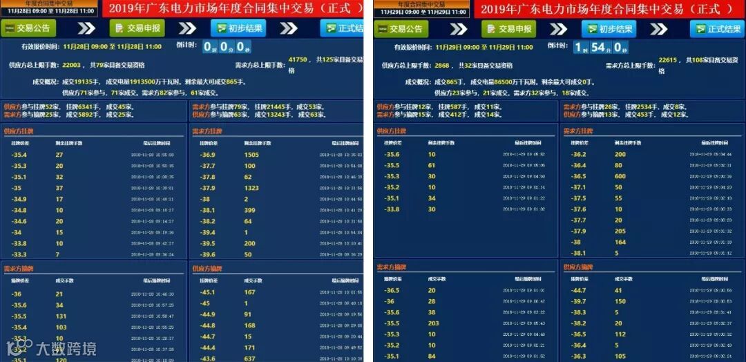 2018年11月28日,即2019年年度双边协商交易开盘的第一天,场上需求方对电量的需求表现强烈,仅一小时就已成交13166手共计131.66亿千瓦时电量,11月28日的交易电量达191.35亿千瓦时,占全盘的95.68%。而11月29日开盘仅6分钟,供需双方便提前完成剩余的交易量。