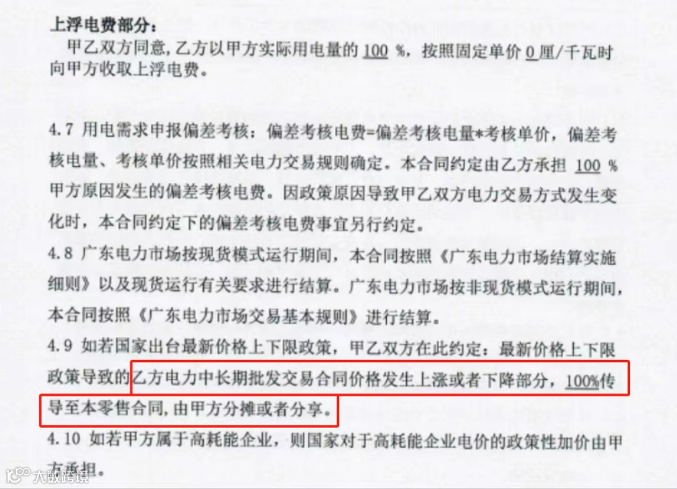 售电公司首先展示较低的固定价格,但同时又在套餐后描述固定价格执行标准,如:“固定签约价格以上调后政府规定的上限价格执行”(2024年固定价格上限为0.554元/千瓦时)。此类合同对固定价格定义模糊,在最终网签时,售电公司很可能以较高的价格绑定线上合同,导致双方纠纷。这损失,实属是大呀!
