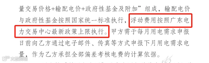 如有些合同中规定:“浮动费用按照广东电力交易中心最新政策上限执行” (2024年浮动电费上限为0.015元/千瓦时)、“上浮电费按照相关规定,甲乙双方如无特别规定,则按照每千瓦时贰拾厘执行”。