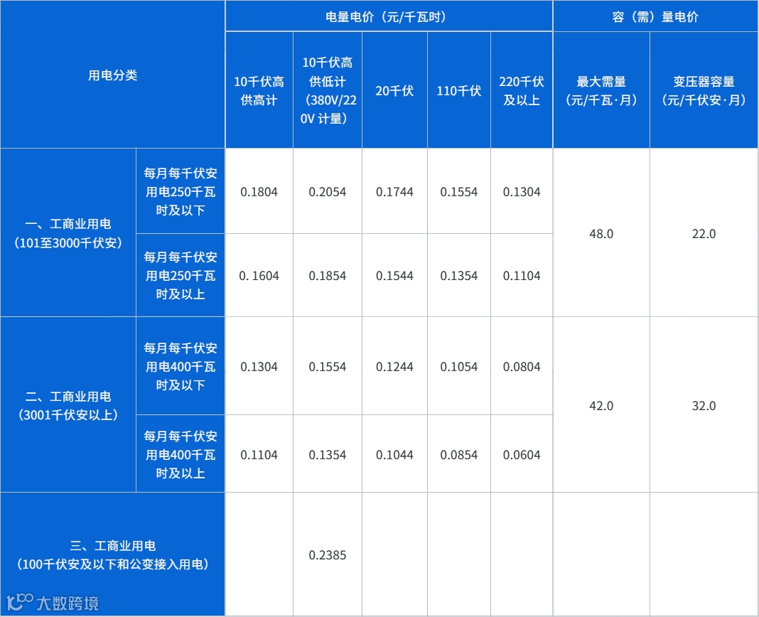 调整后的基本电价如下: