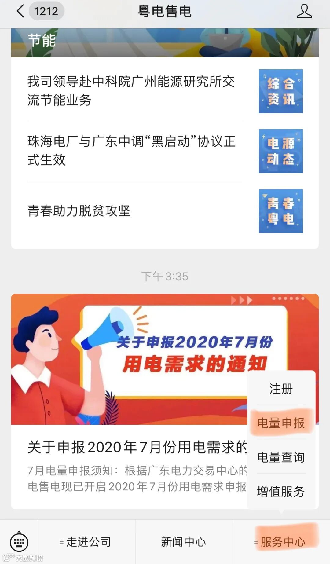 通过底部的“粤电售电” 二维码关注我司公众号(微信号:GD_SD01),从“服务中心-电量申报”菜单申报。
