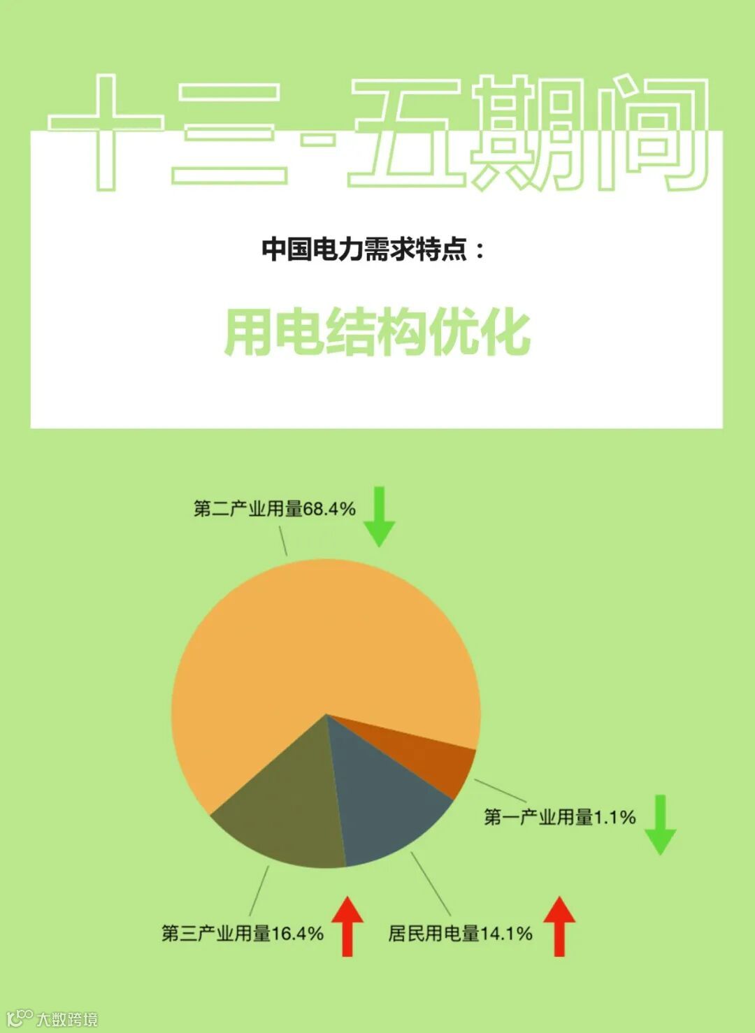 2019年第一第二产业用电量分别占总用电量的1.1%和68.4%,较2015年下降了0.77和4.4百分点。而第三产业和居民用电分别占总用电量的16.4%,14.1%,较2015年提高3.8和1.3个百分点。